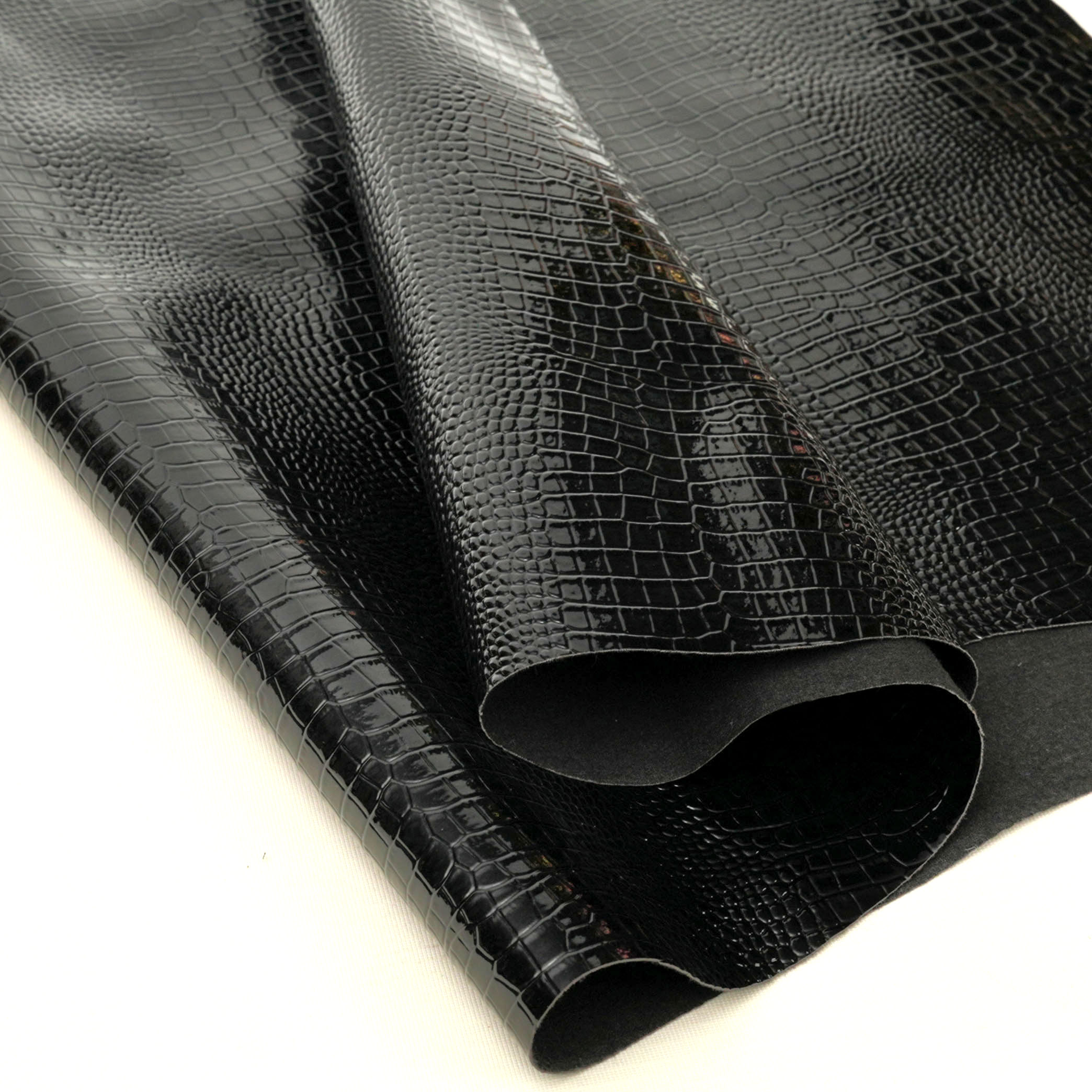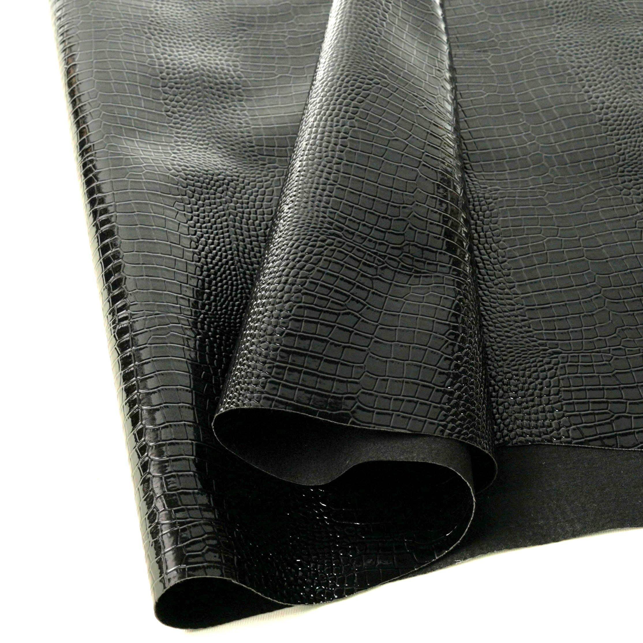 This black high-gloss PVC animal pattern leather features a stylish litchi grain texture and a sleek glossy finish, making it ideal for fashionable bags, sofas, and accessories. With a 0.8–1.0mm thickness and double brush backing, it provides durability, comfort, and excellent processability.